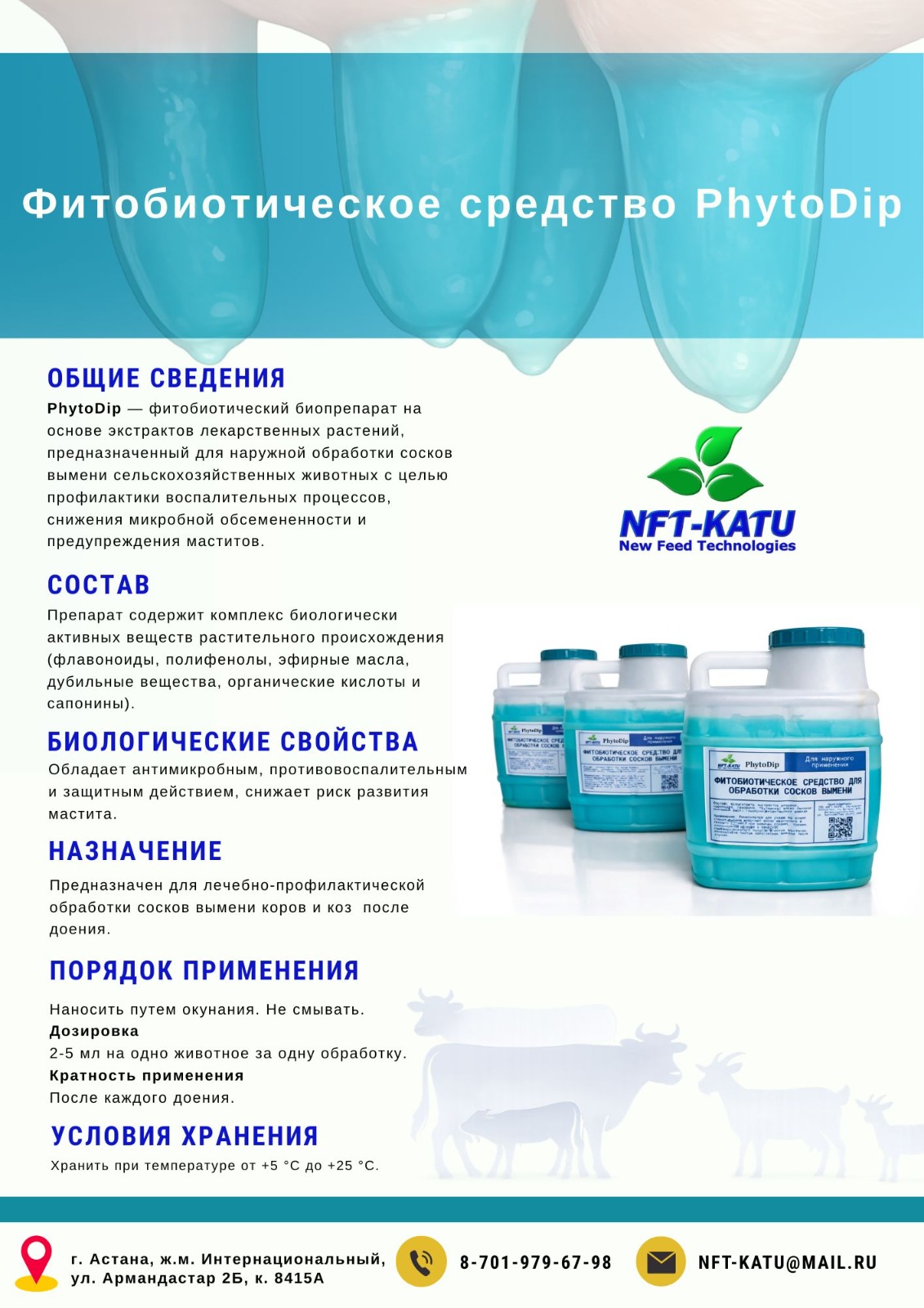 Препарат разработан в рамках выполнения грантового научного проекта ИРН AP23484620 «Разработка и внедрение фитогеников и фитобиотиков для профилактики и лечения маститов животных с оценкой качества и безопасности молока»